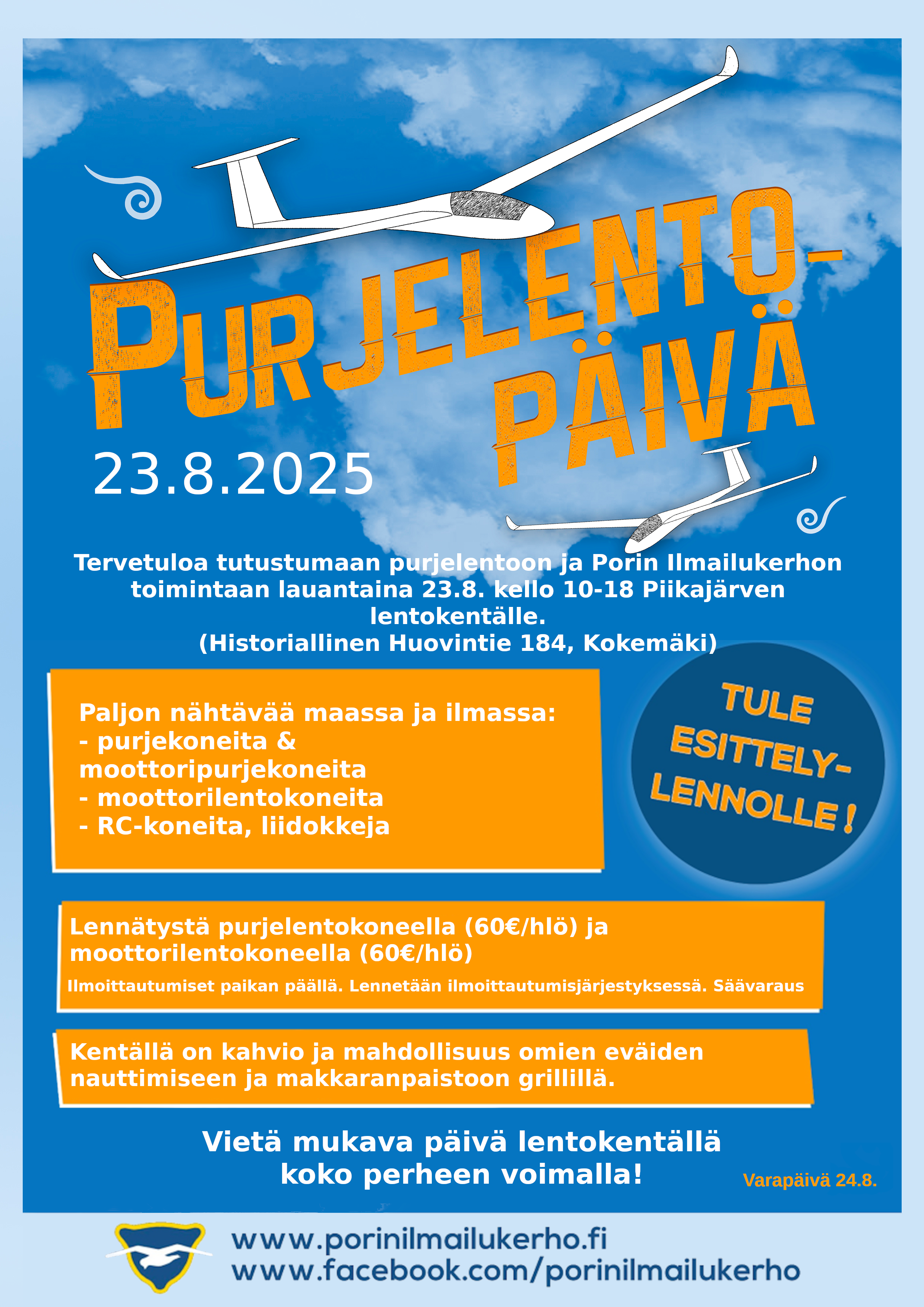 23.8.2025 Pohjoismainen purjelentopäivä Piikajärven lentokeskuksessa. Tule paikan päälle tutustumaan toimintaamme ja viettämään ilmailuaiheista päivää.